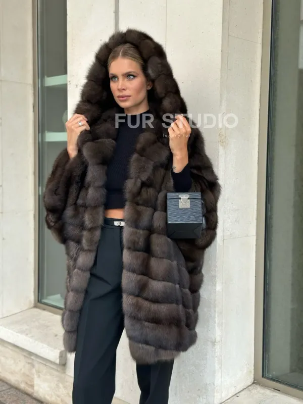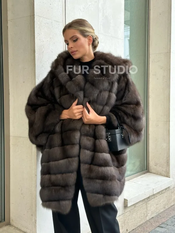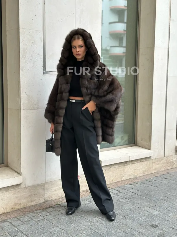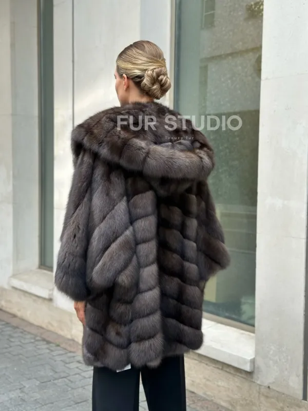 Ждем вас в шоуруме студии меха Fur Studio в Москве. У нас вы сможете примерить и купить жакет из меха соболя с капюшоном и широкими укороченными рукавами.