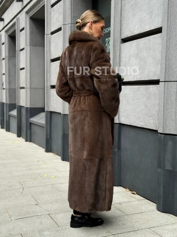 Мех данной шубы аукционная норка , цвет коричневый. Предлагается в размерах от 42 до 52. Длина модели 125-130 см, что выгодно подчеркивает фигуру девушек. Эта модель идеально подойдет для девушек и женщин, предпочитающих роскошные натуральные меха.