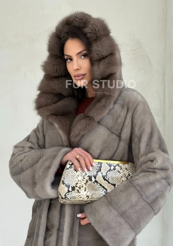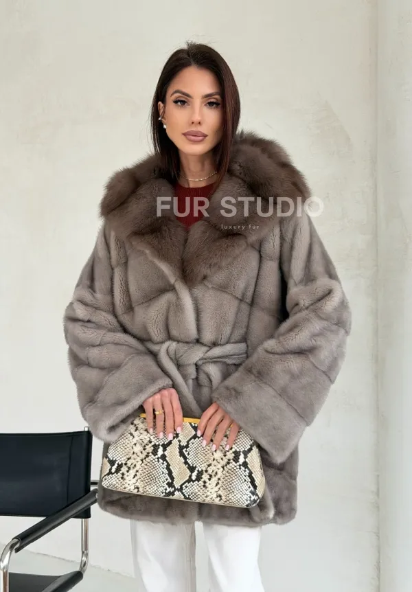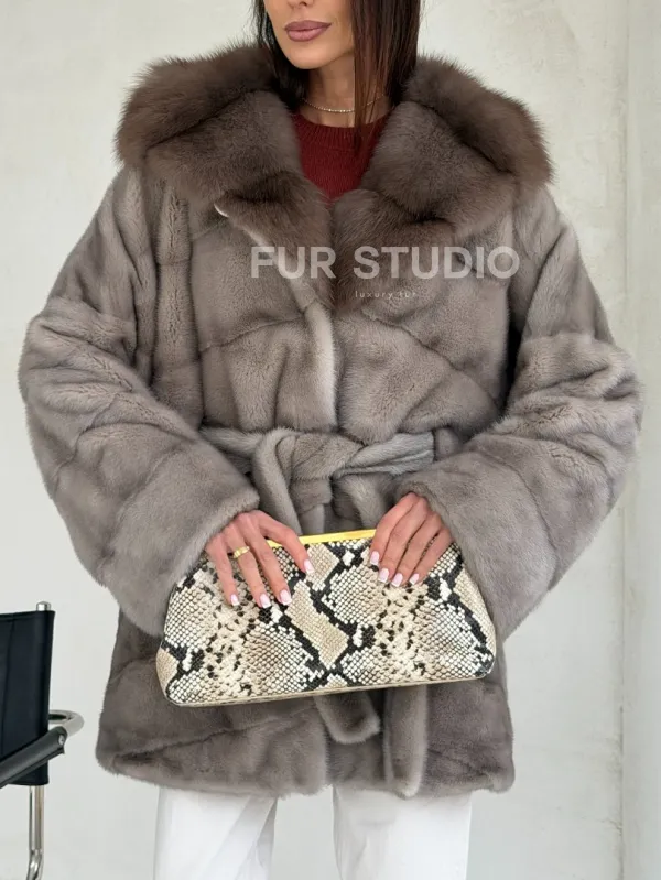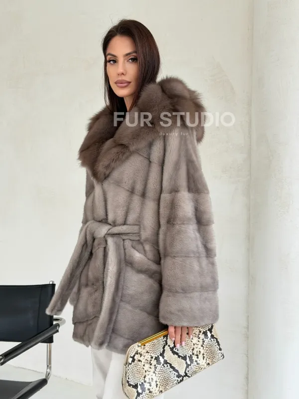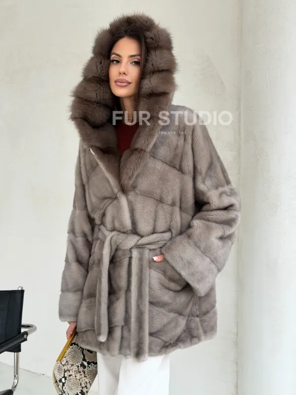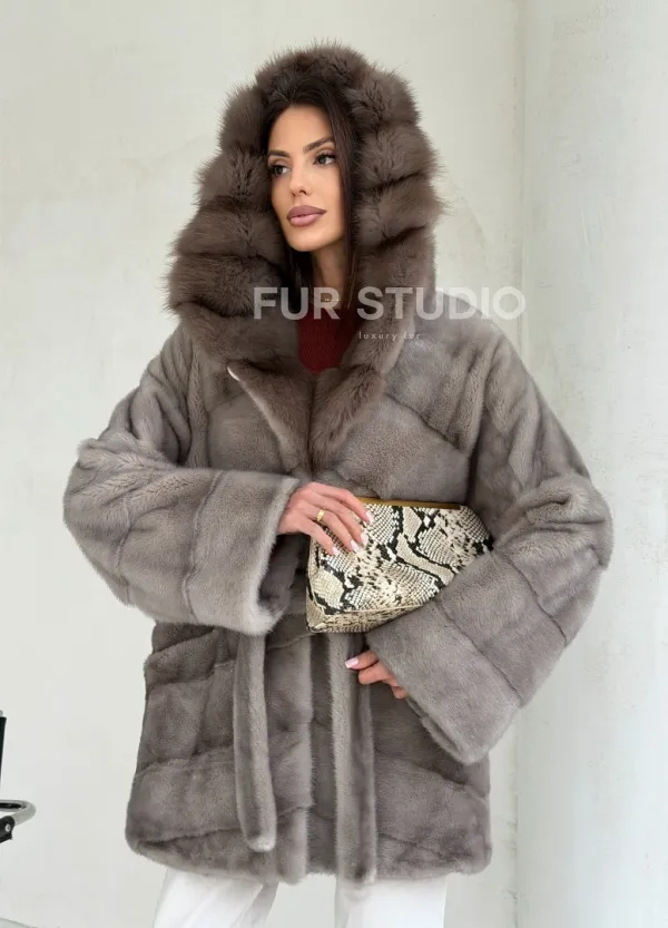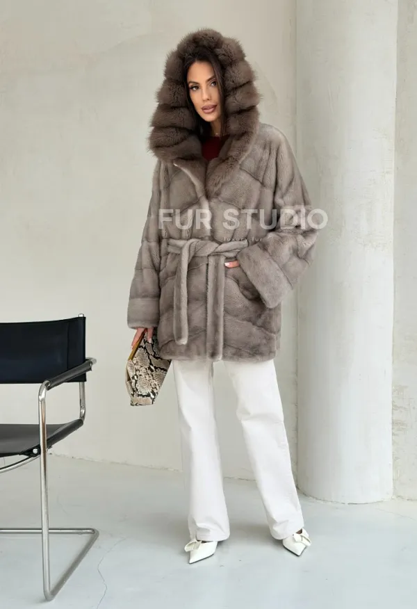 Серый норковый полушубок - капюшон куница 102553