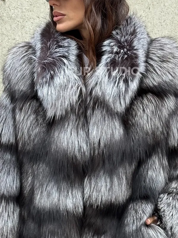 Мех данной шубы лиса, цвет серый. Предлагается в размерах от 42 до 50. Длина модели 65-70 см, что выгодно подчеркивает фигуру девушек. Эта модель идеально подойдет для девушек и женщин, предпочитающих роскошные натуральные меха.