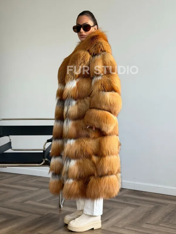 Мех данной шубы лиса, цвет рыжий. Предлагается в размерах от 42 до 48. Длина модели 115-120 см, что выгодно подчеркивает фигуру девушек. Эта модель идеально подойдет для девушек и женщин, предпочитающих роскошные натуральные меха.
