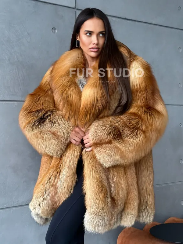 Мех данной шубы лиса, цвет рыжий. Предлагается в размерах от 40 до 52. Длина модели 80-85 см, что выгодно подчеркивает фигуру девушек. Эта модель идеально подойдет для девушек и женщин, предпочитающих роскошные натуральные меха.