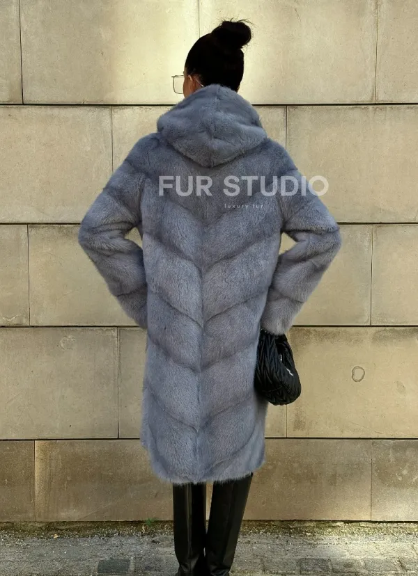 Мех данной шубы аукционная норка, цвет голубой. Предлагается в размерах от 42 до 50. Длина модели 95-100 см, что выгодно подчеркивает фигуру девушек. Эта модель идеально подойдет для девушек и женщин, предпочитающих роскошные натуральные меха.