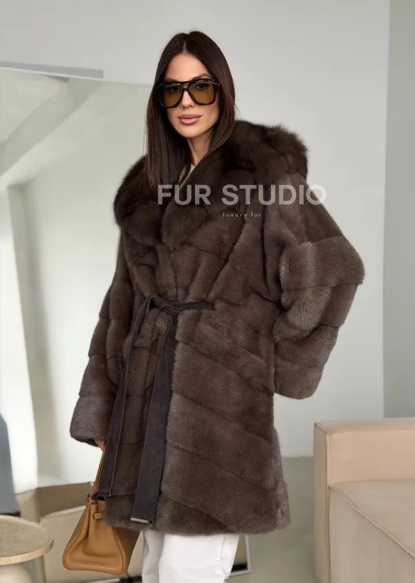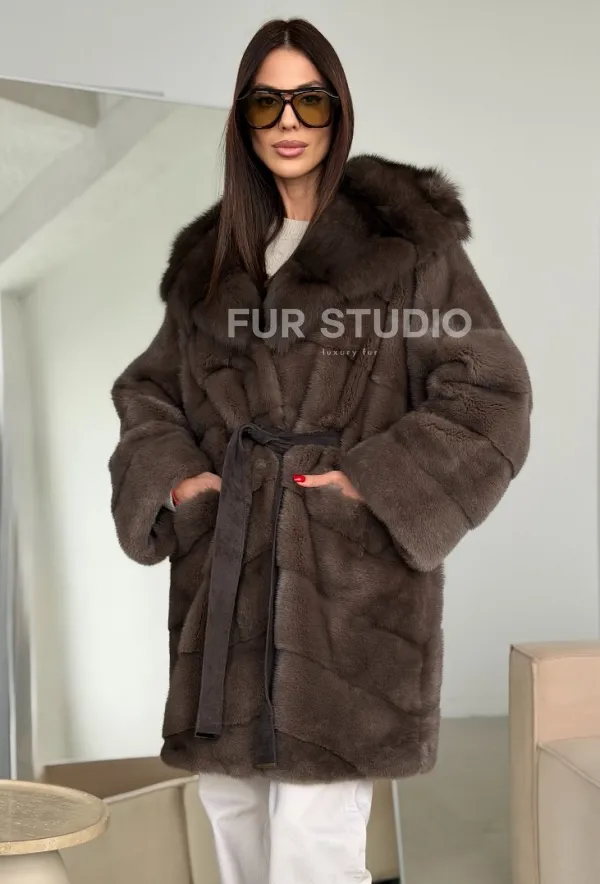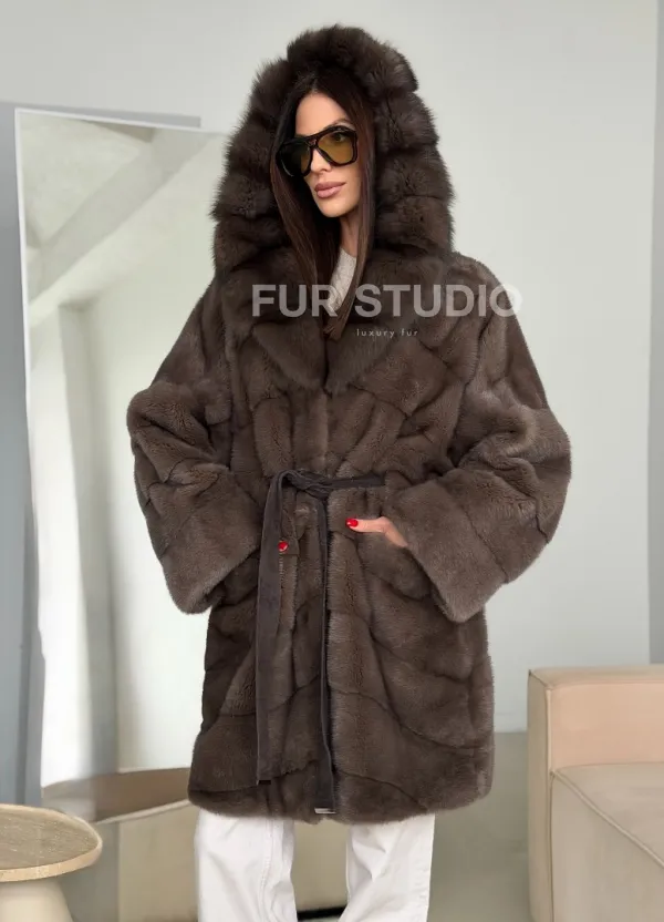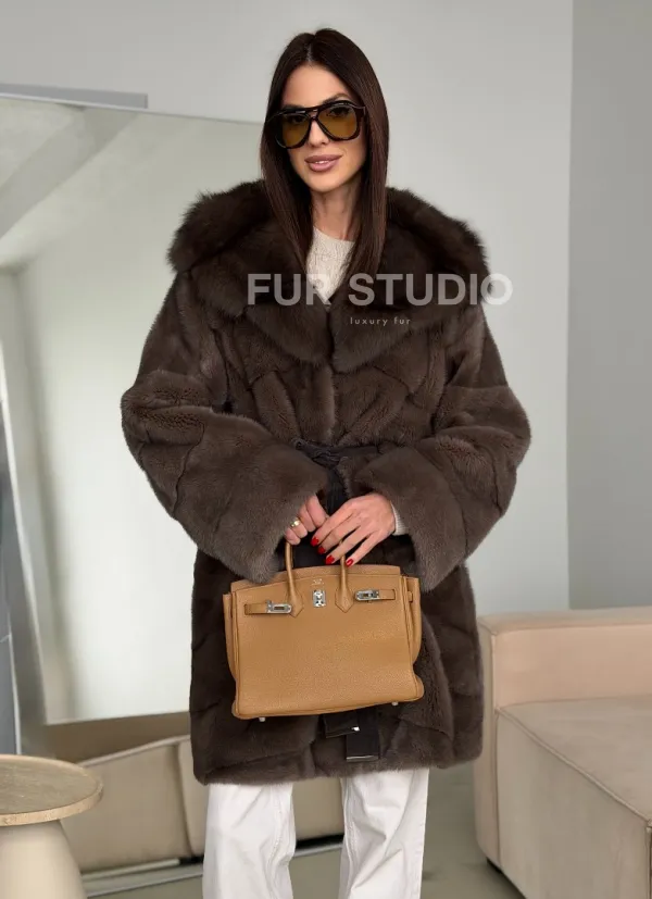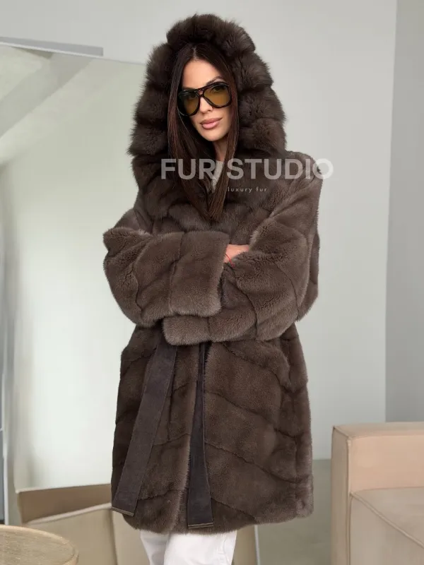 Шуба норковая с капюшоном из куницы 102786