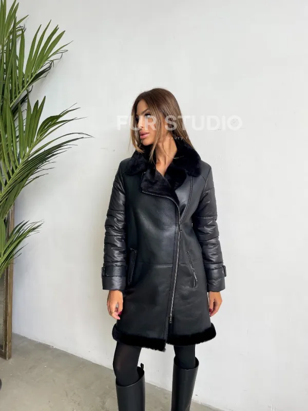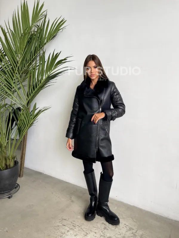 Удлиненная черная дубленка авиатор 102125