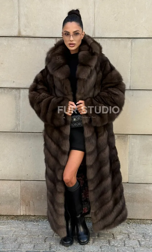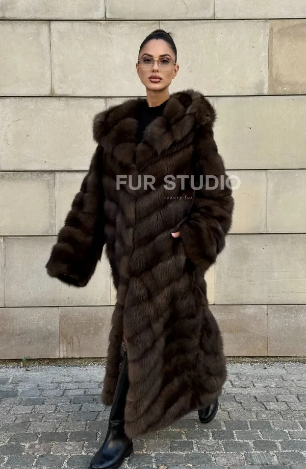 Удлиненная шуба из меха куницы с капюшоном 101056