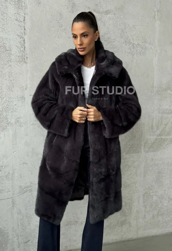 Мех данной шубы аукционная норка, цвет серый. Предлагается в размерах от 42 до 60. Длина модели 95-100 см, что выгодно подчеркивает фигуру девушек. Эта модель идеально подойдет для девушек и женщин, предпочитающих роскошные натуральные меха.